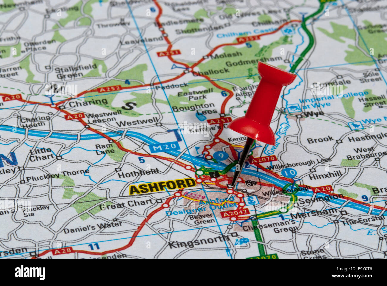 red map pin in road map pointing to city of Ashford Stock Photo